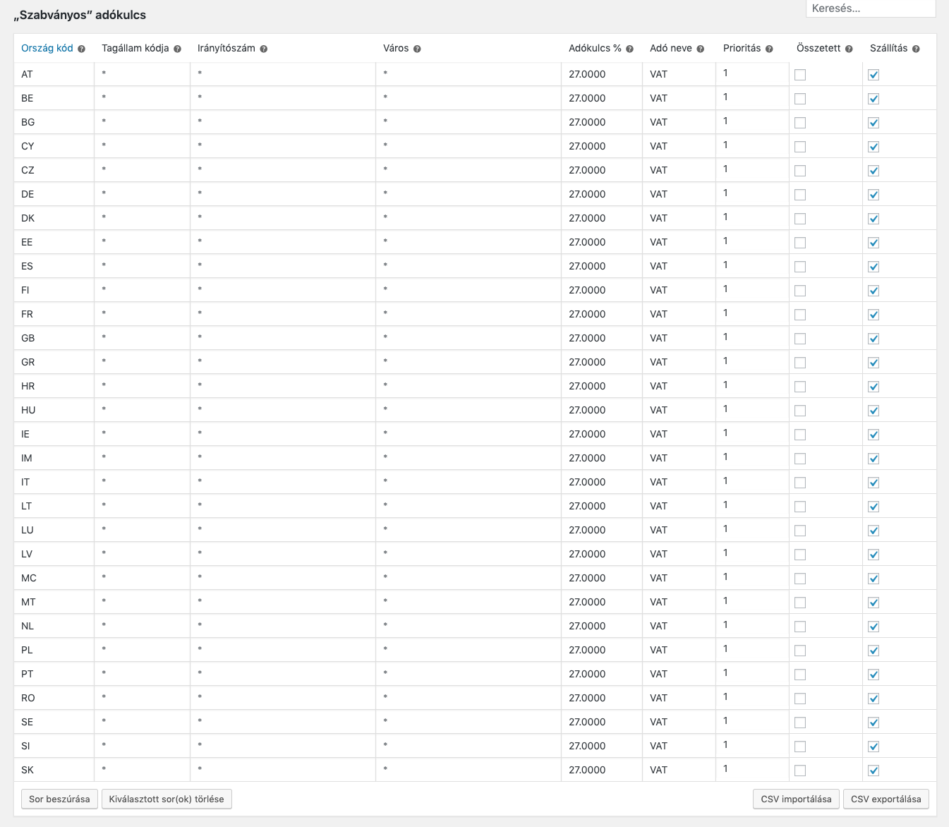 Ha külföldre is szállítasz, akkor az európai unión belül ugyanúgy 27%-os áfát kell számolnod, viszont azon kívül 0%-ot, hiszen a terméket vámolni fogják és a vásárlónak kell a saját országában a forgalmi adót befizetni(vannak kivételek, például egy bizonyos export forgalom felett az adott célország áfáját kell számolni és hasonlók, a könyvelőddel egyeztess). A beállítás ebben az esetben ugyanúgy egy adózási osztály segítségével történik, csak minden EU-s országhoz létre kell hoznod egy új adókulcsot 27%-os értékkel. Tehát a Normál Árak táblázatod így kell, hogy kinézzen: