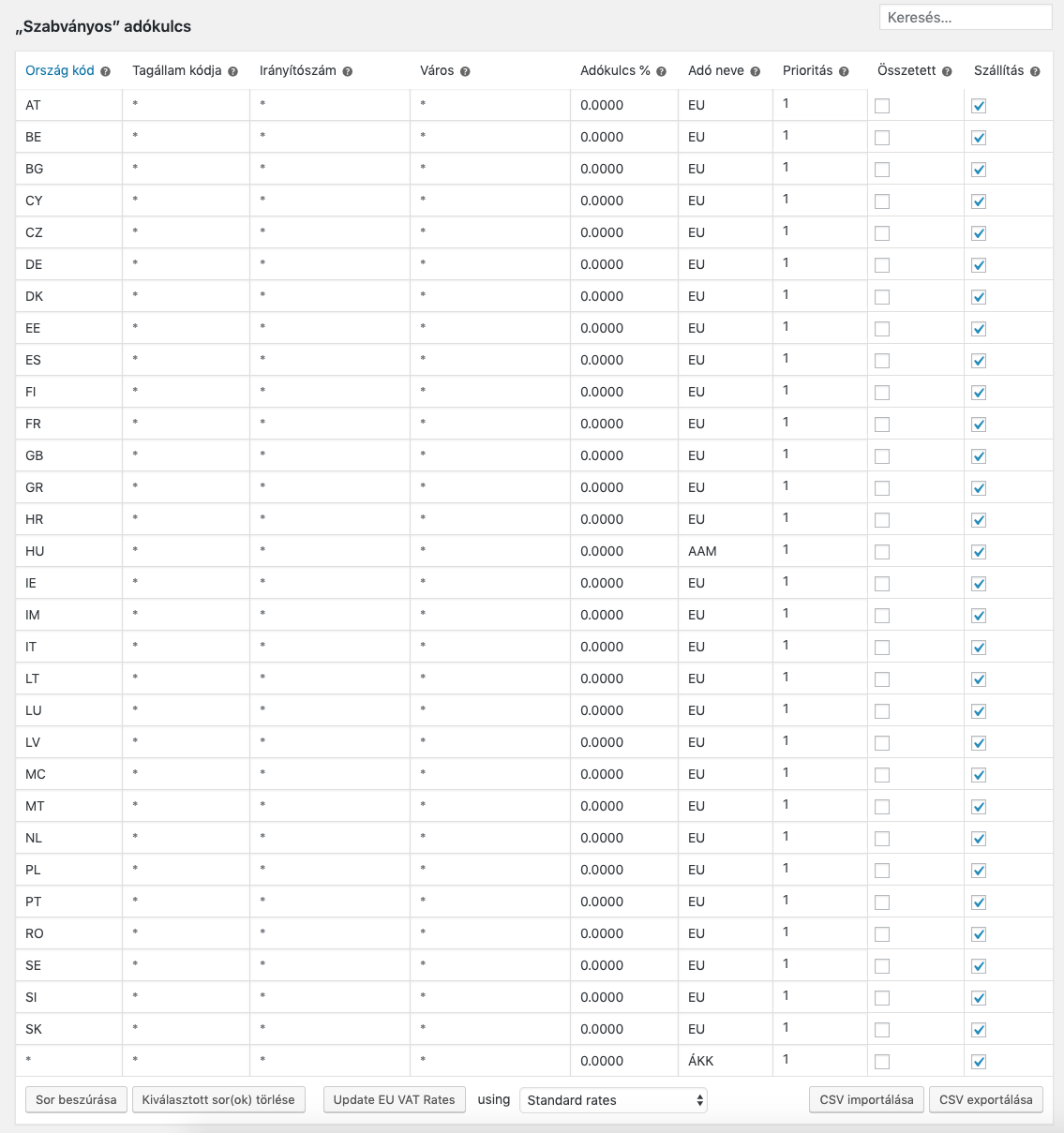Digitális termékeknél(például letölthető tartalmak) Európai Unión belül magánszemélyek számára a célország áfáját kell hozzáadni. Tehát ha van egy vásárlód Németországból, akkor a magyar 27%-os áfakulcs helyett a német, 19%-os értéket kell a nettó árhoz hozzáadni. Itt is érvényes az a szabály, hogy ha megadja a vásárló az uniós adószámát, akkor nettóban kapja a terméket. A fent említett WooCommerce EU VAT Assistant (új ablakban nyílik meg) bővítmény megoldja ezeket a kérdéseket. A bővítmény aktiválása után látni fogsz a Normál árak menüpontban egy Update EU VAT Rates gombot. Erre kattintva betölti az aktuális vámuniós országok áfakulcsait. Ha importálni szeretnéd egy CSV fájlból, ide kattintva letöltheted (új ablakban nyílik meg) a képen látható listát: