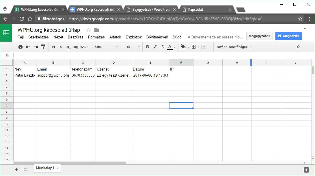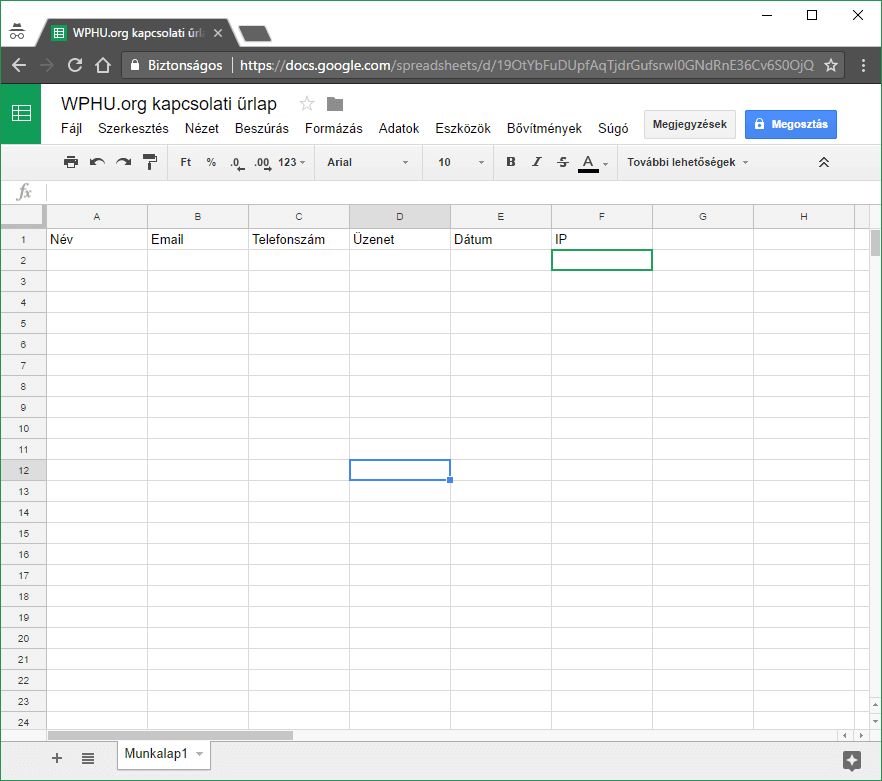 Az egyik weboldalam űrlapjának az adatbázisát szerettem volna úgy megosztani a munkatársaimmal, hogy azon egyből dolgozni is lehessen. Erre tökéletes megoldást biztosít számunkra a Google Táblázat; külön bónusz, hogy így egyszerre többen is tudunk a táblázaton dolgozni és látjuk, hogy mit csinál a másik.