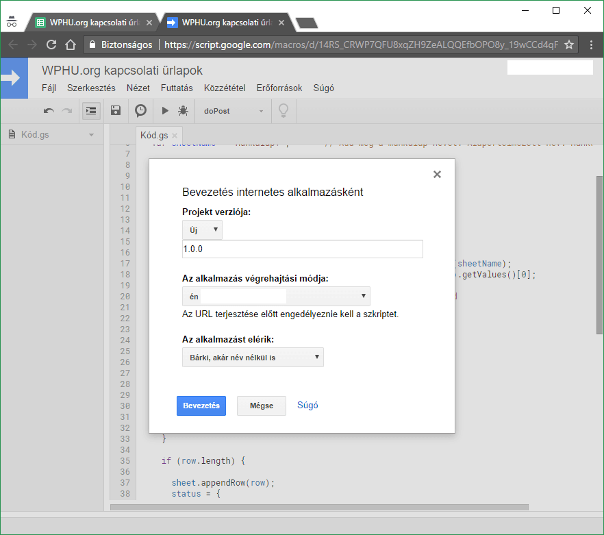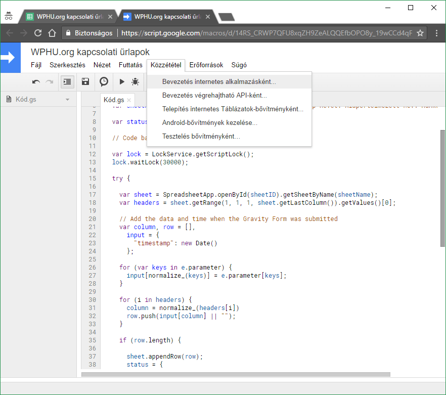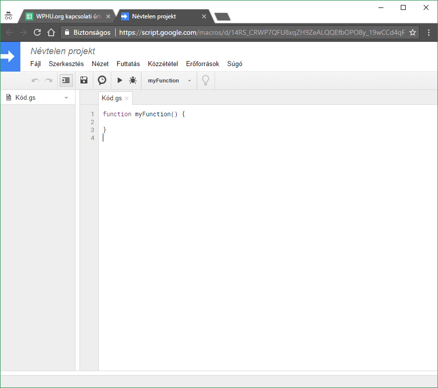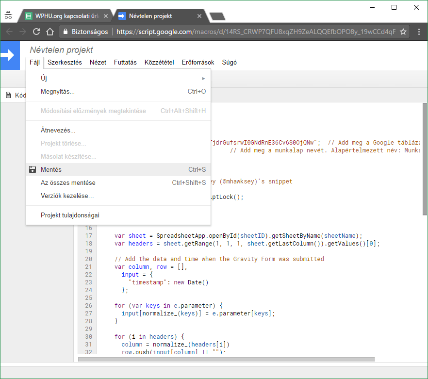 2.) Készítsünk egy új Google szkriptet (Eszközök->Szkriptszerkesztő)