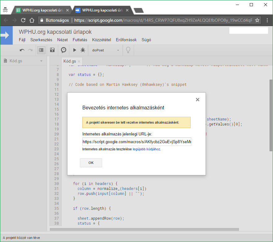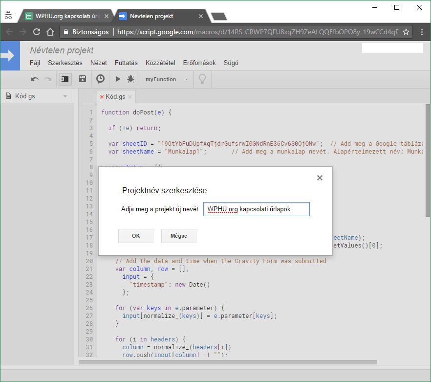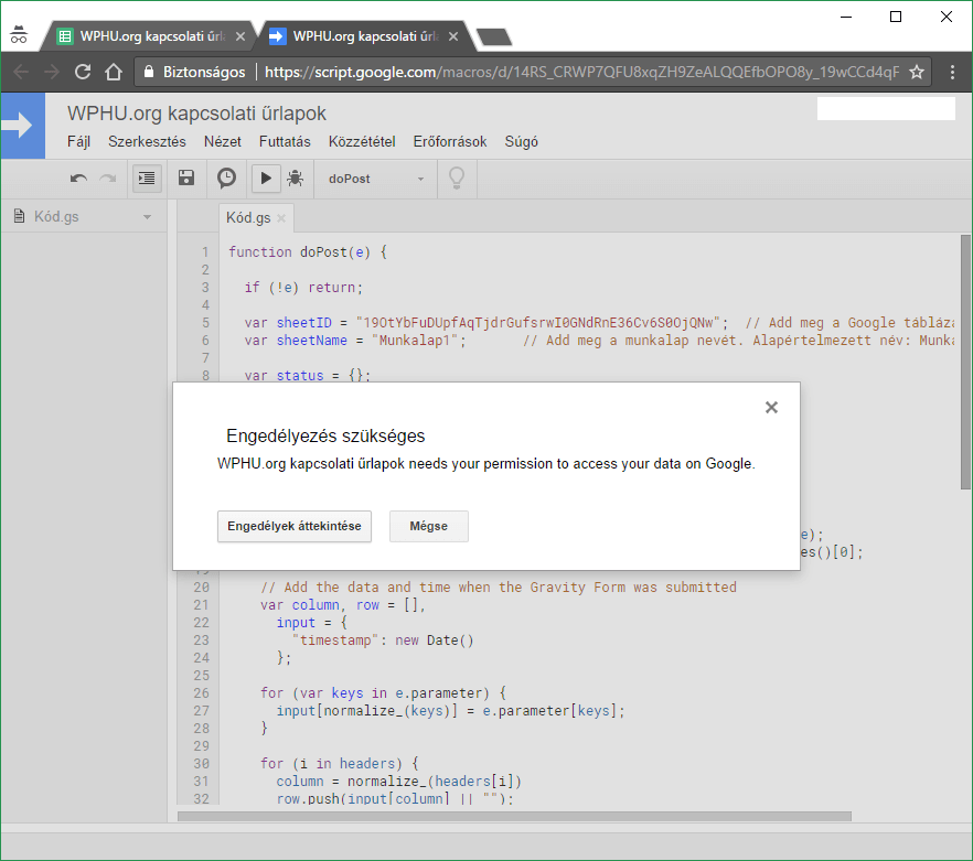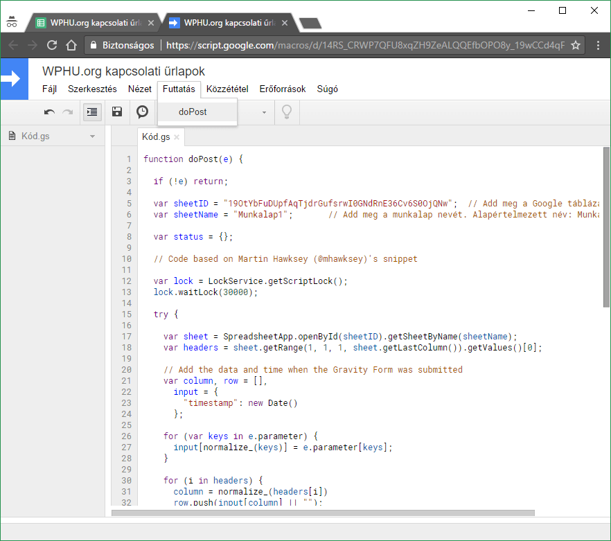 var sheetID = „GOOGLE_TABLAZAT_IDKOD”; // Add meg a Google táblázatod ID kódját