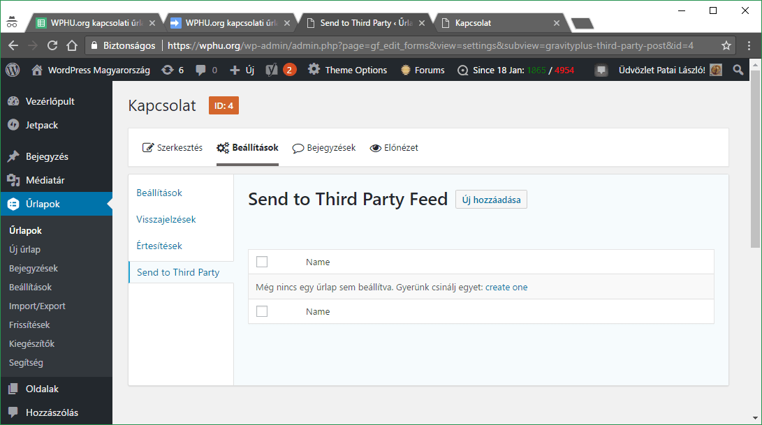 Miután feltelepítettük fent említett bővítményt (Gravity Forms Post to 3rd Party API letöltés), megjelenik egy új menü az űrlapok beállításainál: Send to Third Party Feed