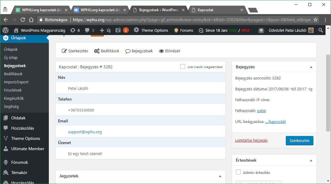 (Megjegyzés: A Gravity lehetőséget biztosít a beküldött adatok CSV-ben történő mentésére és minden beküldött adatot eltárol, amit a WordPress adminban megtalálunk)