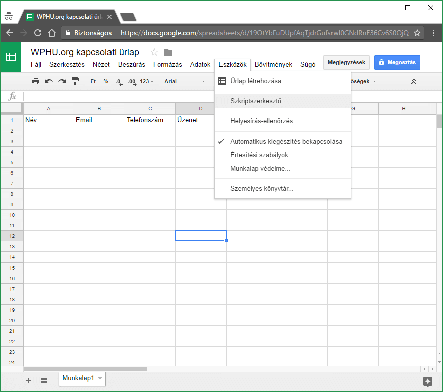 var sheetName = „Munkalap1”; // Add meg a munkalap nevét. Alapértelmezett név: Munkalap1